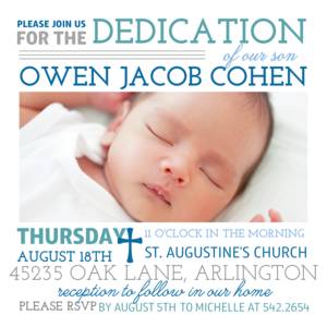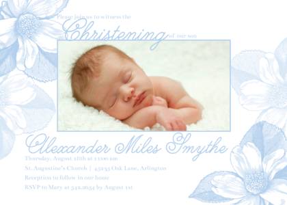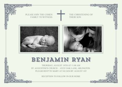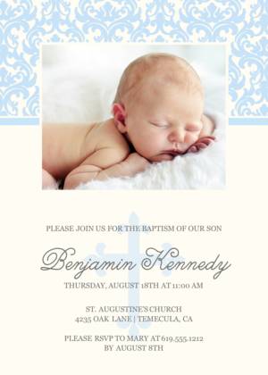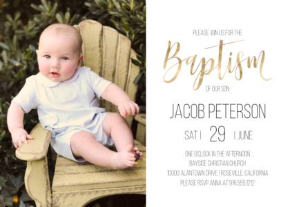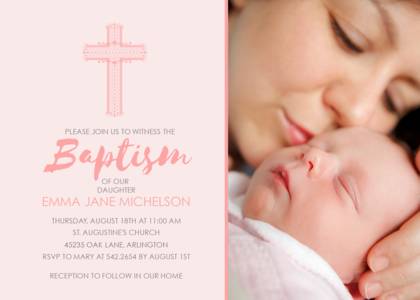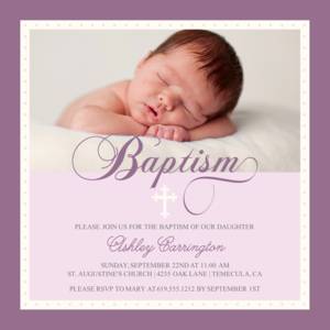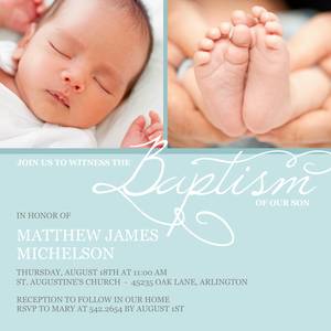 Your baby's Christening or Baptism is a wonderful moment in your child's life. One of the ways you can signify this is to include quotes in your text that inspire faith in your guests as well as in your child in years to come. The card can be framed, placed in a photo album, or turned into a magnet card so that you have it forever. You may also want to consider making your own photo albums with pictures from this important day at a later date. One of the latest trends in religious invitations is to include a picture of the baby on the front of the card rather than simply using text.