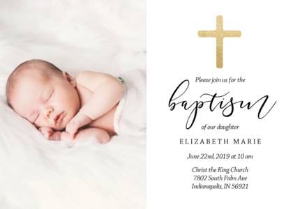 Tailor-made Baptism photo invitations and Christening card templates offer a unique way to show loved ones that you want to include them in the opportunity to celebrate this milestone in your child's life. As your child's initial entrance into your religious beliefs, this event is important not only to you but to other family members participating in your faith. It makes perfect sense that you want to capture this event in a gorgeously designed photo card, while also inviting the people who matter most to your family to attend the event. As you make your own Baptism or Christening invitation, you can choose a unique design to reflect the individuality of your child as you cherish this moment in your lives. All of the options at Mixbook are fully customizable, giving you the freedom to select your favorite fonts, themed accents, and attractive colors for your card.