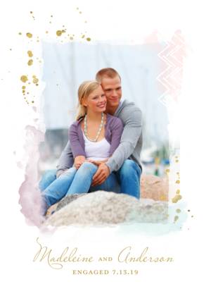Vibes expressed through the personalized engagement cards range from truly sentimental to humorously poking fun at the groom for taking so long to ask her. Sometimes images may tie into the seasons or a theme that is near and dear to the couple's hearts. Plan to include your most epic photos (think favorite vacation shots!) alongside your names, the projected wedding date (if you know it), and any other special notes you might like to share. Metallic shades of gold and silver continue to dazzle wedding stationery, along with fancy accents like foil or special finishes.