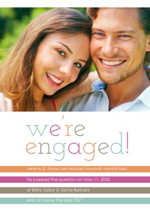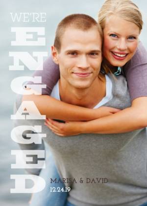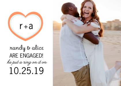 Congratulations on your engagement! Few things in life hold the same excitement as the moment of a proposal and a promise. Soak up the blissful anticipation and bask in the joy of knowing you're going to spend the rest of your life with the person you love most in the world. Don't you just want to shout it from the rooftops? Share your happy news with our custom engagement announcements, featuring gorgeous designs, fine quality paper, and stunning photos capturing the love between you and your betrothed.