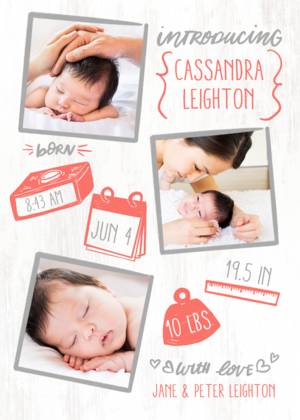 Beautiful customized birth announcement templates are a personal way to introduce your brand new baby to all of your family and friends. Show off your new arrival with a stylish birth announcement showcasing your baby's very first photos