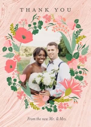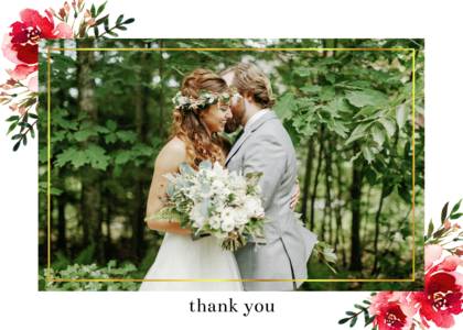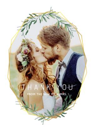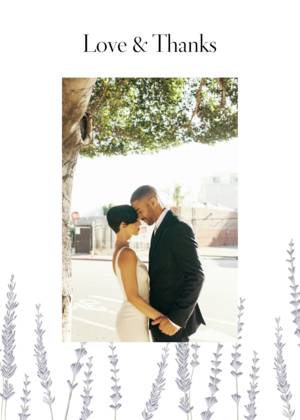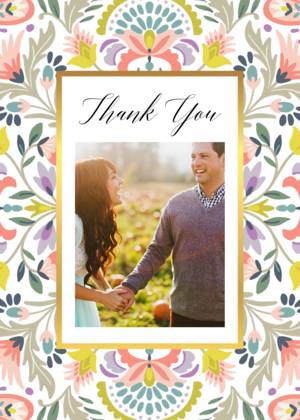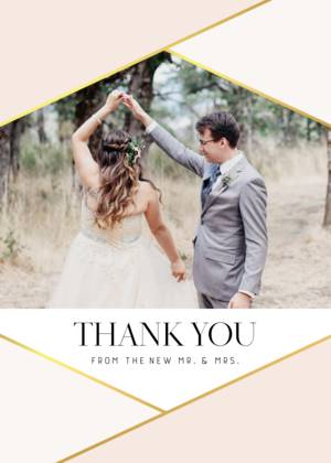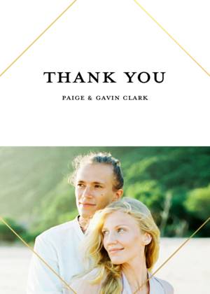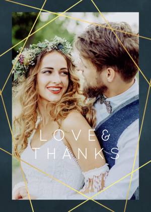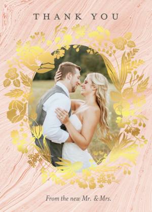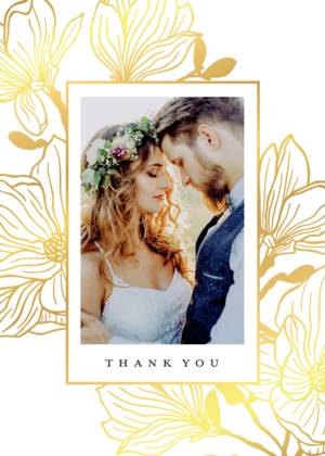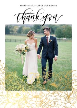 Forget the tired, plain thank you cards of ages ago. Our wedding thank you cards complement the look and feel of all of your wedding stationery. You can choose a simple, minimalist style thank you card with your initials or your names and the wedding date. Alternatively, you can share a favorite picture in your own customized wedding thank you photo cards. Showcase a favorite wedding photo or a collage of favorites to give your guests a lasting memento of your gratitude for their attendance and their gifts. All of our wedding thank you cards feature fine quality paper or cardstock as well as special touches designed to uplift the look and feel of your cards. Choose from rounded or traditional corners, and portrait or landscape layouts. Add a little glamour with real foil accents and hues of gold, among other fully customizable details.Wedding Thank You Card Trends and Ideas